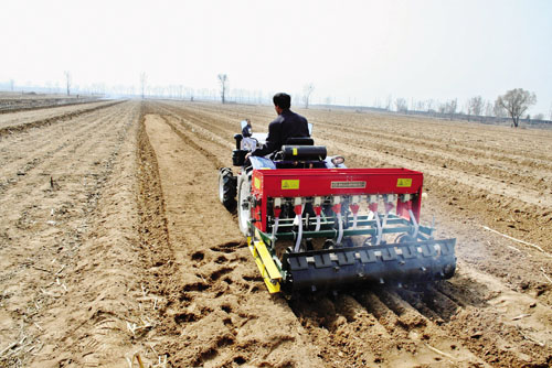 3月18日,原平市新原乡小河村,一名农机手正在播种小麦,田野上一台台正在作业的农业机械呈现出一派“铁牛闹春”的繁忙景象。(赵月仁 摄)