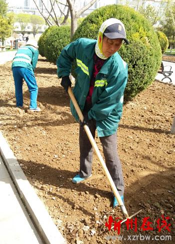 春暖花开,4月13日,忻州市人民公园的园林养护人员忙着翻地、施肥,为不同花期的育苗做准备。忻州市人民公园是我市城市文明的一大场所,为全方位提升人均环境质量和城市竞争力,给广大市民创造一个文明、卫生、安全、和谐的休闲游乐环境,园林养护人员一年四季不断地为公园绿化服务,确保公园内的花、草、树都能如期开花、结果。(李涛 摄)