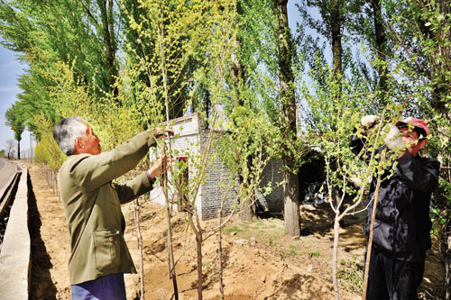 代县县委、县政府坚持“生态绿色发展,共建美好家园”的执政理念,今春铺开了总投资1120 万元的108 国道东段通道绿化工程、投资2000 多万元的巩固退耕还林项目干果经济林工程和京津风沙源治理工程以及全民义务植树工程,切实做到规划高起点、施工高质量、建设高标准、开发高效益。代县作为京津地区的风沙源头,通过历年坚持不懈的生态绿化,全县已拥有林地面积171 万亩,占到总国土面积的66.3%,基本实现了“春季花满坡、夏季绿荫浓、秋季五彩画、冬季松柏青”的美好愿景,为京津地区筑起了防风固沙绿色屏障。图为工人们在修剪树株。(石俊文 摄)