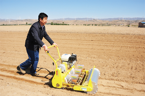 5 月14 日上午,位于繁峙县金山铺乡郝家湾村的海丰农场的谷子试验田里,山西农业大学教授郭平毅正在为村民们演示韩国产小籽粒播种机的操作要领。山西农业大学开展“送技术下基层”活动,他们为海丰农场送来了2 台韩国产小籽粒播种机。(乔伟 摄)