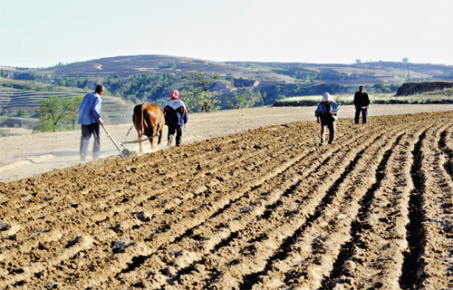 入夏以来,河曲县山区农村进入繁忙季节,梁峁沟坡,广阔的田野上随处可见农民在耕地、施肥、铺膜、下种紧张忙碌的身影,构成一幅幅山区农村美丽的农忙画卷。图为五月十七日,鹿固乡下榆泉村村民在耕地种植高产玉米。(邬耿杰 摄)