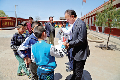 2006 年由省委组织部扶贫工作队和省侨办牵线搭桥,由海外华人创建的欣欣教育基金会向静乐县康家会小学捐赠一万美元资助建设新校舍,新校舍于2006 年8 月份投入使用。5 月17 日,该基金会副会长丁永庆一行深入静乐县,走访基金会当年捐建的康家会小学。图为基金会工作人员在和学生交谈,了解学校现在存在的问题和困难,希望与该校保持长期固定的联系,以便进一步的交流和帮助。(闫晓梅 摄)