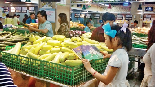 5 月22 日下午5 点多,记者在城区家家利超市看到一个小姑娘在菜摊前认真看书,等着旁边的妈妈挑选蔬菜。当时超市购物的市民很多,可周围嘈杂的环境丝毫没有影响小姑娘看书的兴致。(许净 摄)
