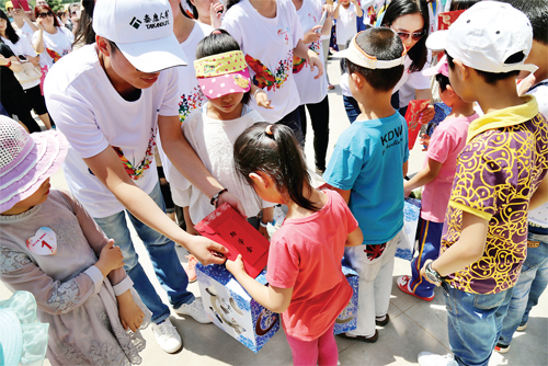 5 月30 日上午,共青团五台县委举办了“献礼华诞、慈善同行”公益活动。泰康人寿山西分公司带着对老区人民的深情厚谊,向该县豆村镇新庄小学捐赠助学金2 万元、课桌椅150 套、书本文具1506 件、衣物601 件和健身设施1 套。图为贫困学生在领取助学金。(王铁虎 摄)