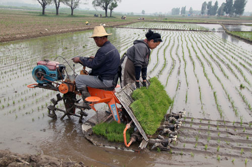 5 月31 日,原平市东营村的稻田里机声隆隆,一派繁忙景象,农机员正驾驶着铁牛在插秧。这是该村头一回用上了现代化的插秧机种植水稻。村民们高兴地说:“如今惠农政策就是好,现代农机化作业为俺农民种田致富插上了金翅膀。”(赵春晓 摄)