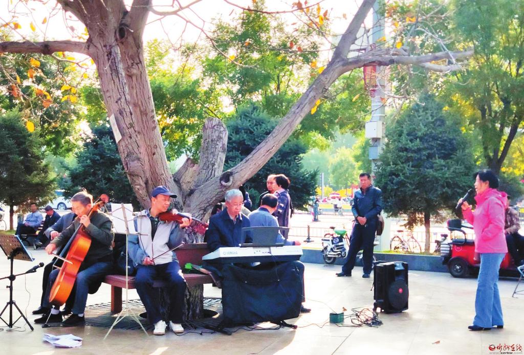 金秋十月,在庆祝新中国71华诞之际,由数十名老年音乐爱好者组成的乐团,在城区日月广场一隅举行了一场别开生面的演奏演唱会。他们演唱了《我和我的祖国》《歌唱祖国》等耳熟能详的歌曲,讴歌祖国,歌颂幸福生活,同时吸引了不少往来行人驻足观看。(康馨月 摄)