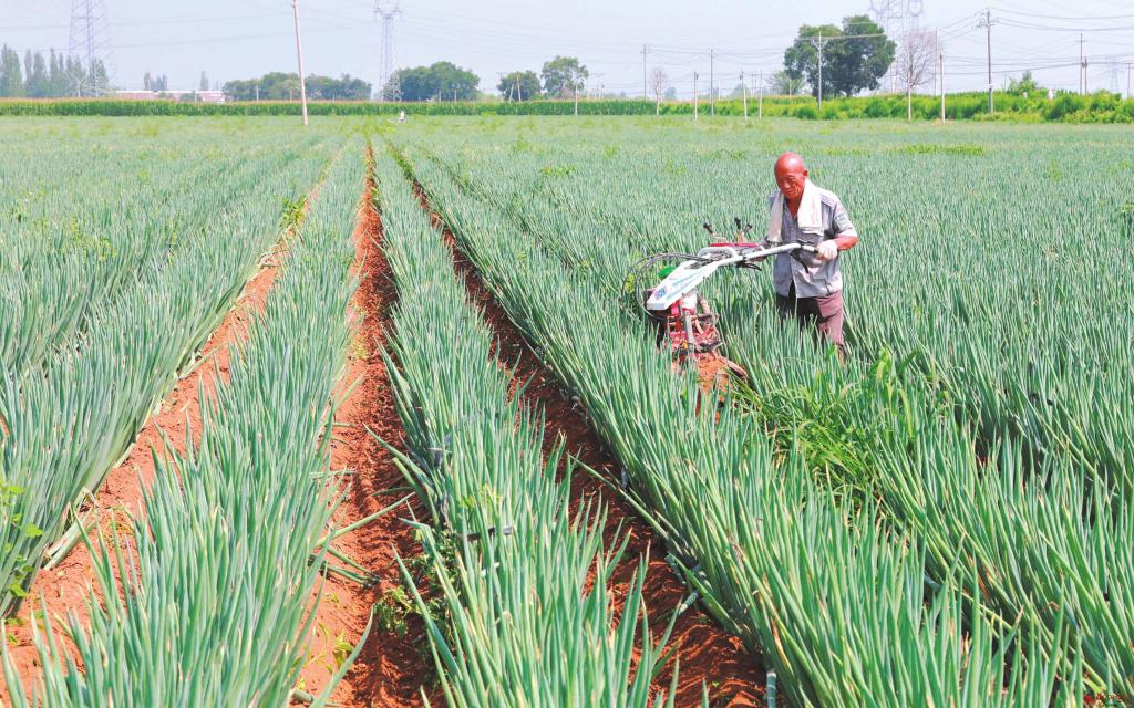 7月23日,记者在忻府区董村镇南胡村看到,千亩大葱长势喜人,农民忙碌穿梭于田间,正在对大葱进行精心管护。(