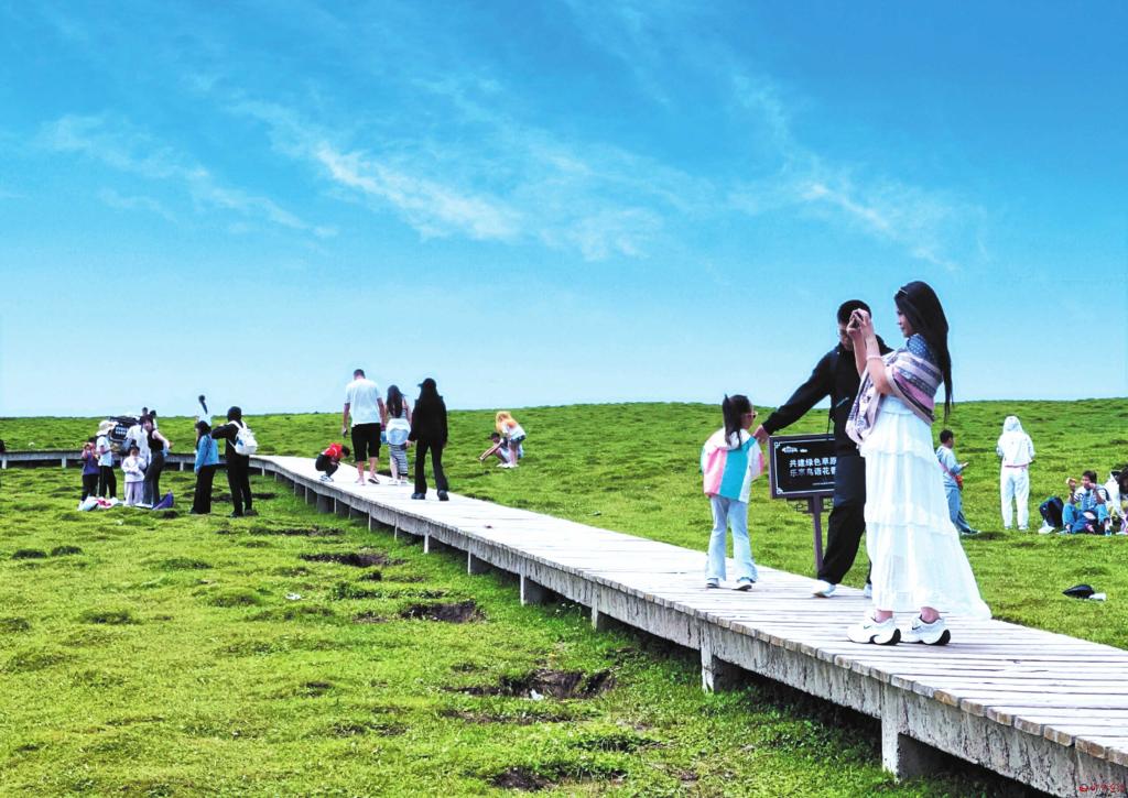 入伏以来,宁武芦芽山旅游度假区的马仑草原迎来众多游客。蓝天白云下,木质栈道蜿蜒穿过翠绿草场,游客或漫步赏景、或拍照留念,沉浸在夏日草原的自然美景中。(