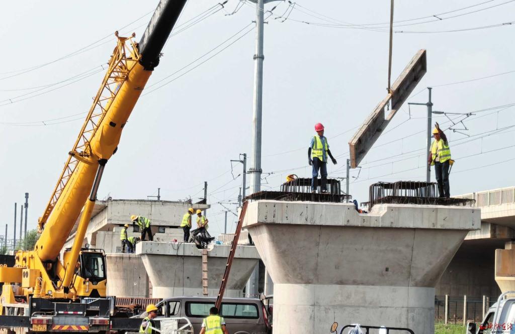 7月23日,在忻府区小奇村北,由中国铁建第十七工程局承建的雄忻高铁高架桥正在紧张施工中。雄忻高铁在我市境内总长115公里,预计2027年建成通车,将成为忻州联通京津冀的战略通道。 (记者 刘纪森摄)