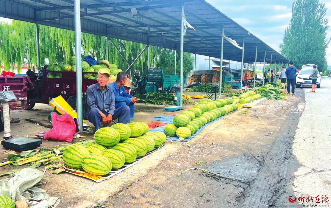 市场有回响,品质过硬销路旺。在村里的瓜果交易市场,75岁的邬培林摊位前,一排排个头饱满的西瓜格外显眼。有着多年种植经验的他对市场行情了如指掌:“西瓜上市半个多月了,刚开始卖两元一斤,现在是6角一斤,正在陆续降价。”虽然价格随上市时间有所回落,但西瓜品质好不愁销路。