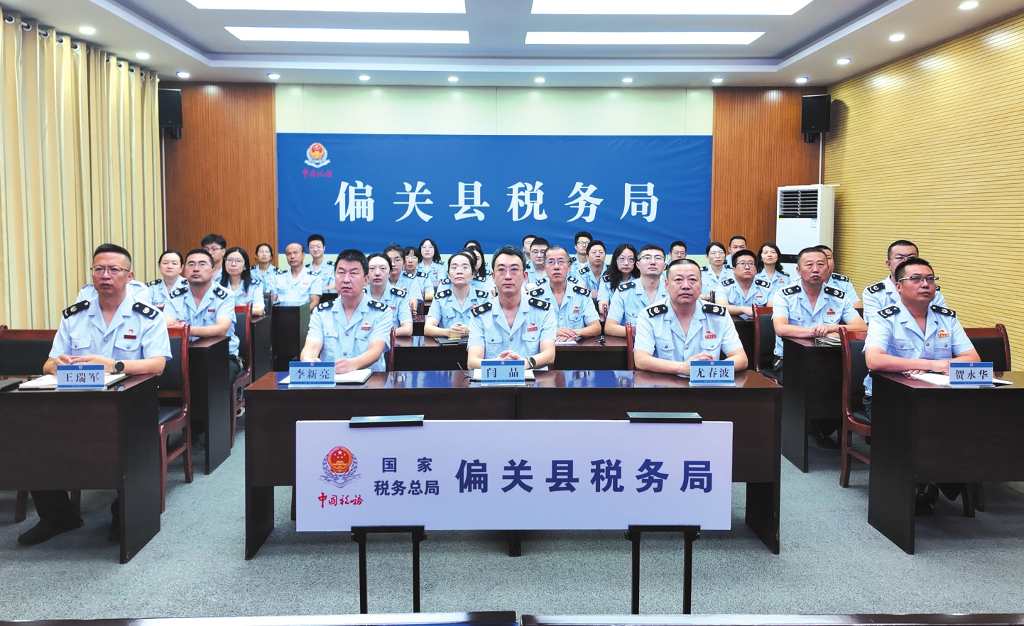 偏关县税务局党员干部观看纪念大会。贺琦摄