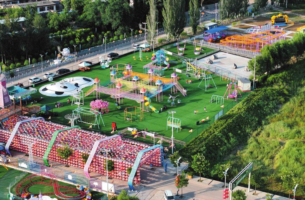 近年来,河曲县唐家会村围绕“宜居宜业和美乡村”建设目标,通过农旅项目集群化、文化资源品牌化、政策激励精准化等举措,探索形成了“特色种植支撑旅游、旅游反哺农业品牌、文化激活乡村美学”的农文旅深度融合发展之路。图为村内的游乐园。(冯晓磊摄)