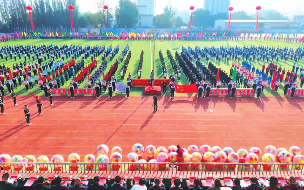 9月28日,原平市范亭中学校运动场上彩旗招展、鼓乐喧天,该市中小学秋季田径运动会开幕,有小学、初中、高中的38支代表队共3000余人参加了开幕式。图为开幕式现场。(吉建平摄)