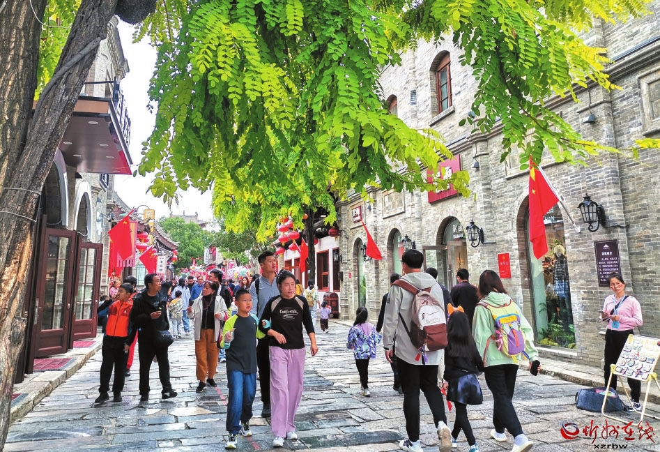 国庆、中秋双节期间,忻州古城又一次爆火,商贸繁盛、休闲安逸的社会生活景象成为游客还想再来的独特记忆。上图为游客徜徉在忻州古城小巷内。(