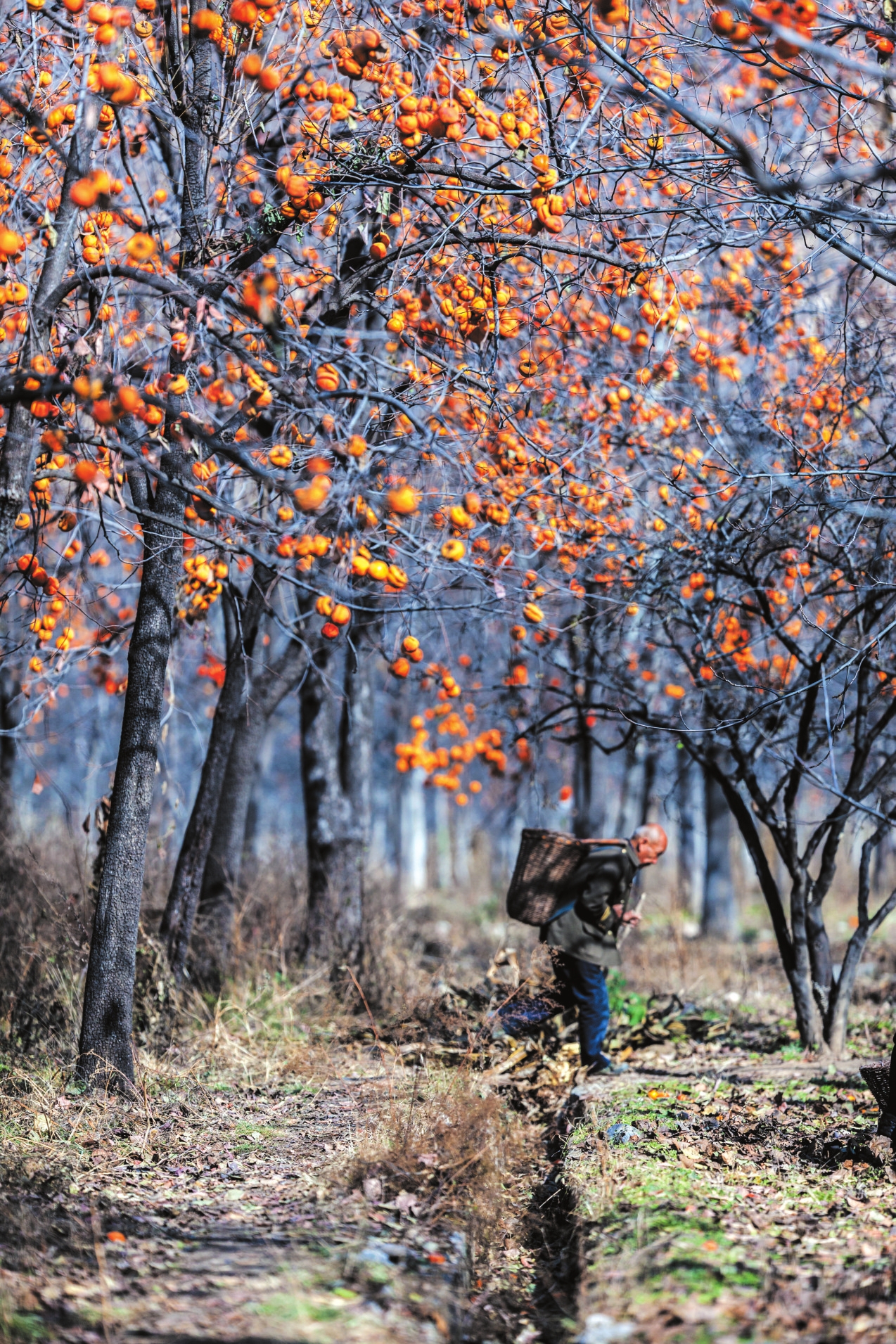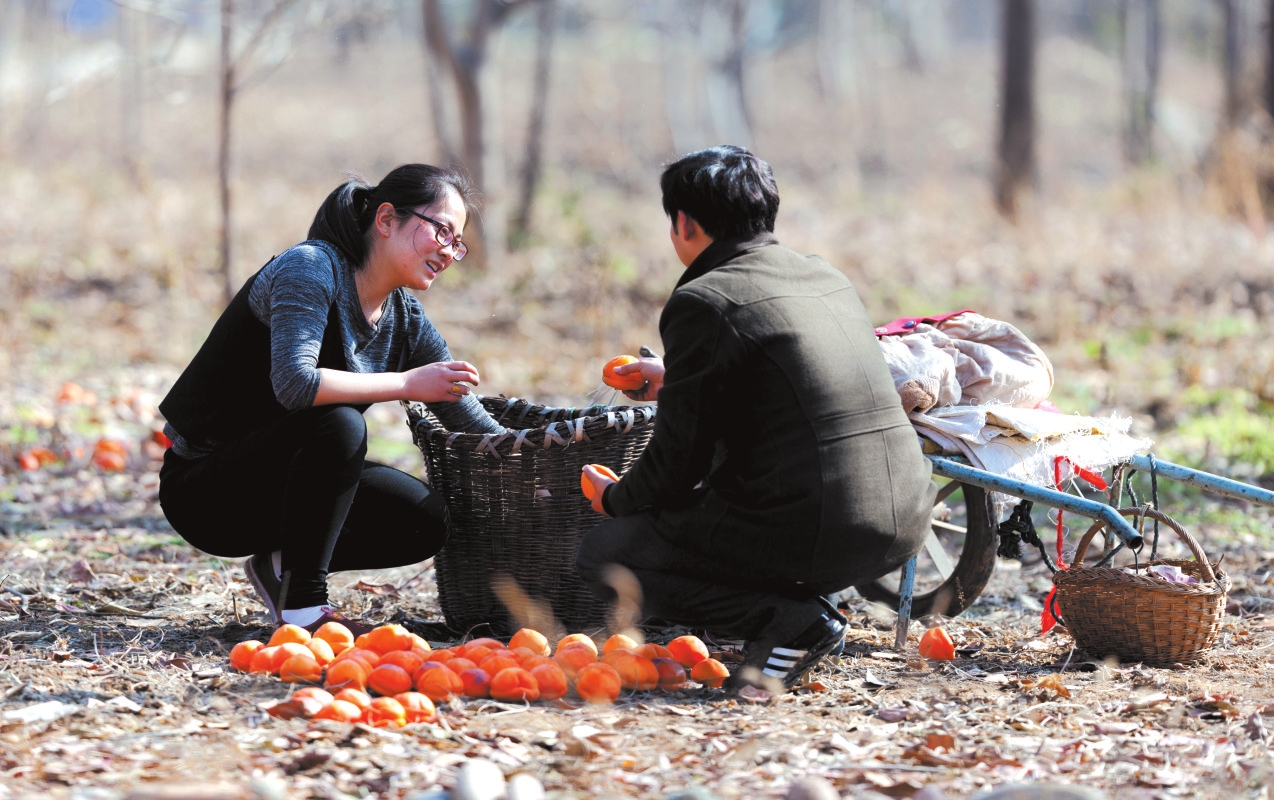 地头那畔,景象便不同了。一对年轻的夫妇,正手脚利落地采摘、分拣柿子。竹篮里,橙红的果实渐渐堆成小山。他们时而低语,声音轻得像风拂过枝梢,说的或许是今年柿子的成色,盘算着能卖个好价钱;或许是在憧憬,等这笔钱到手,该给娃添置些什么。他们额上有细密的汗珠,眉宇间有劳作后的倦色,但那份倦色底下,却藏不住一股子蓬勃向上的劲儿,一种属于明天的、清亮亮的盼头。