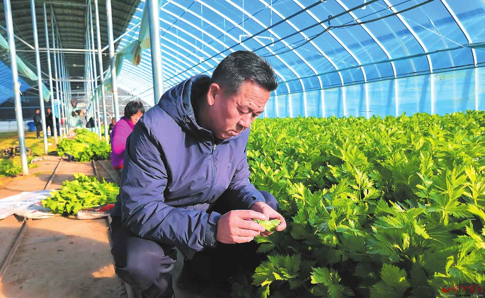 近日,忻府区农业农村局组织农技专家团队深入忻口镇高标准蔬菜育苗基地,开展越冬作物防寒防冻技术指导。图为农技专家查看芹菜生长状态。(赵曼君摄)