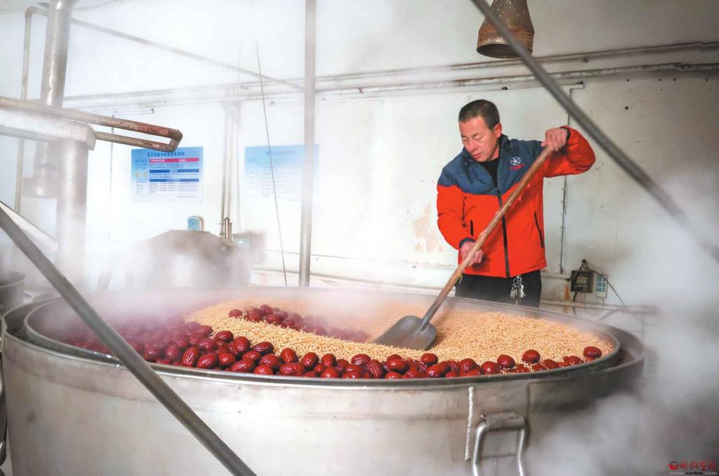 近年来,保德县贡枣酒开发基地以“保德油枣”与枸杞入酒,不仅更好地保留了果实的温补特性,也酿出了独特的地方风味。该基地不仅是当地推动红枣产业深加工、提升附加值的关键项目,也是将地理标志农产品转化为特色商品、助力乡村振兴的生动实践。图为保德县贡枣酒基地,工人在蒸馏车间翻动搅拌麦壳与红枣等原料,车间内蒸汽弥漫。(记者 范琛摄)