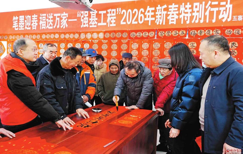 新春将至,年味渐浓。近日,由五寨县文联联合县总工会、团县委举办的“笔墨迎春福送万家”送春联活动走进李家坪乡李家坪、张家坪村,以笔墨为媒传递新春祝福,用文化服务筑牢基层精神根基,让“强基工程”的温暖触角延伸至乡村一线。(刘笃效摄)
