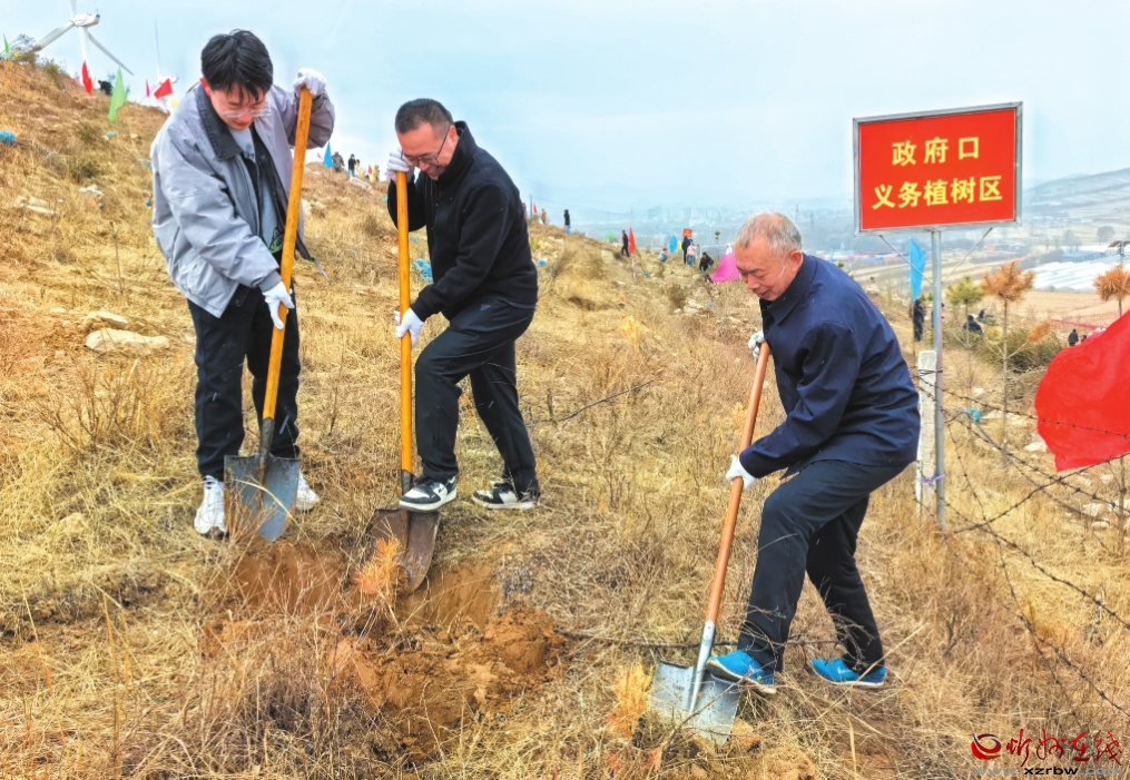 神池县坚持扩绿、兴绿、护绿并举,高标准推进国土绿化,筑牢晋北生态屏障。图为该县抢抓春季植树造林黄金期,广泛动员干部群众在荣庄子村东山头郑志东摄上开展义务植树活动。(郑志东 摄)