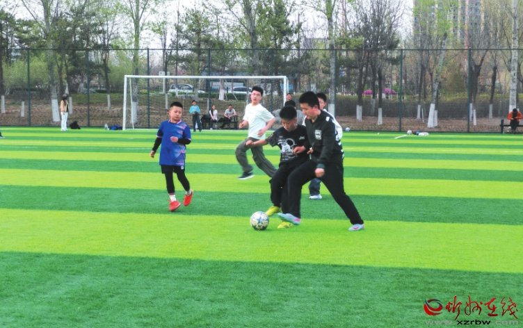 4月12日,云中河景区足球场绿意盎然,我市中小学的学生们正迎着春风奔跑、传球、射门拼抢,额角的汗水与飞扬的球衣,勾勒出青春活力的生动画面。(王 阳摄)
