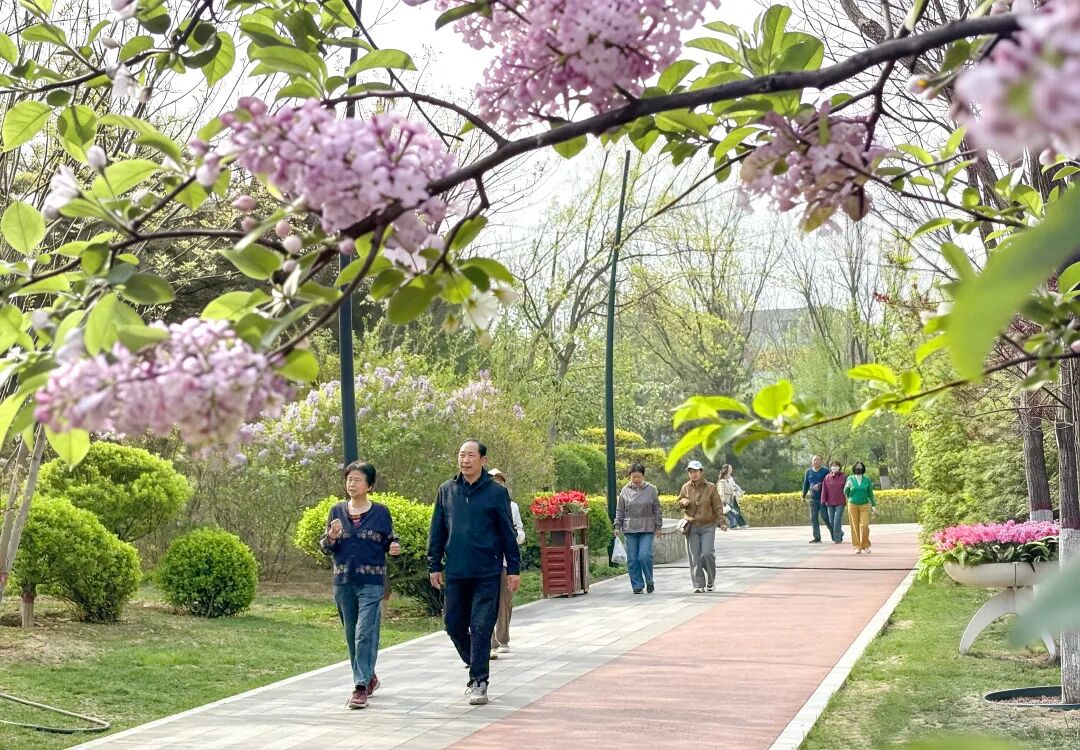 移步城中各大公共空间,更是一步一景:体育公园的桃杏花层层叠叠,迎来最佳观赏期,粉白色的花瓣缀满枝桠,与跑道上奔跑的身影相映成趣;人民公园的玉兰花、碧桃、西府海棠次第开放,映着湖面的波光,岸边垂柳抽出新绿,与繁花共同构成层次丰富的春日图景;遗山公园里,山桃、丁香香气弥漫,市民三五成群,沿着步道悠然散步;古城西园的花开得繁盛热烈,朱红的古建檐角衬着艳而不俗的花簇,尽显晋北古城的春日风韵;作为城市生态名片的云中河景区,步道两侧的繁花映水,偶有水鸟掠过水面,漾出一岸花影。