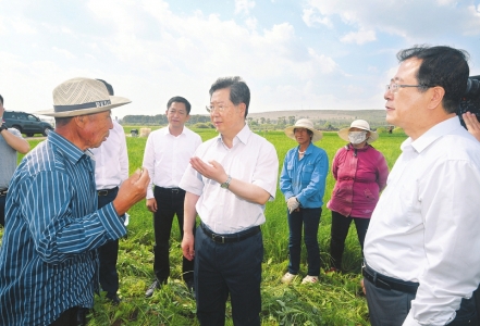 七月十三日,在右玉县威远镇小香葱种植基地,省委书记楼阳生向农户了解产业带动增收情况。山西日报记者李联军摄