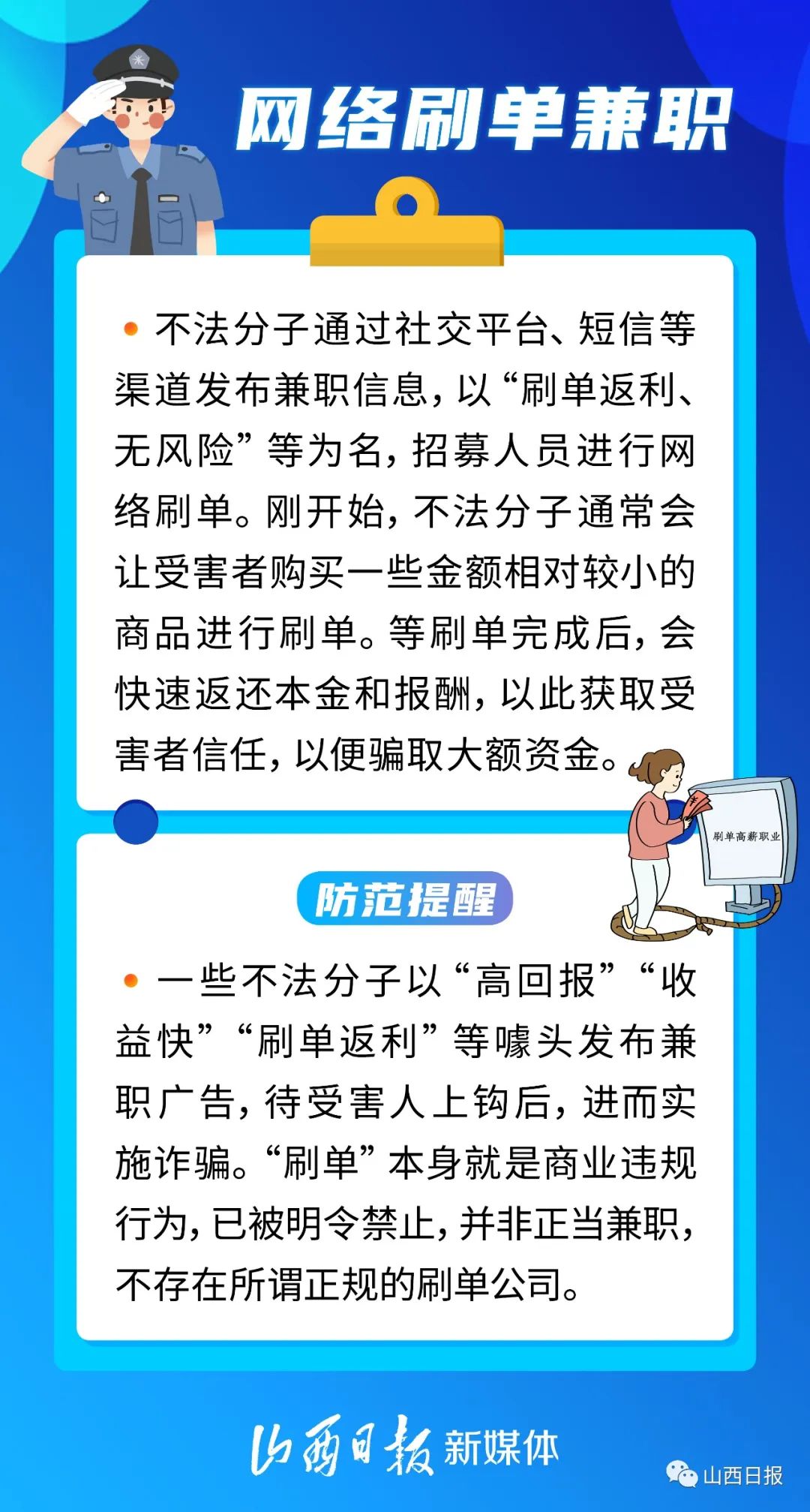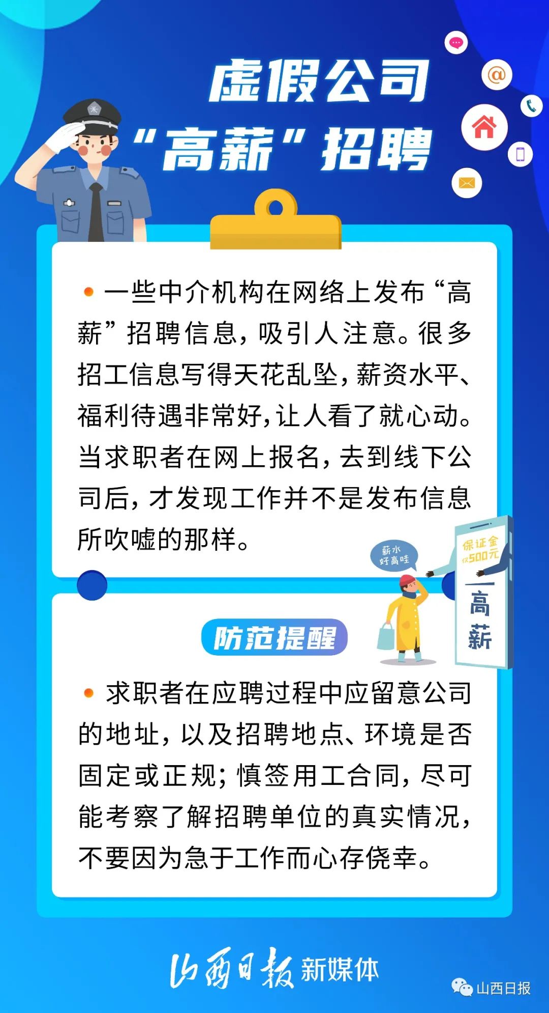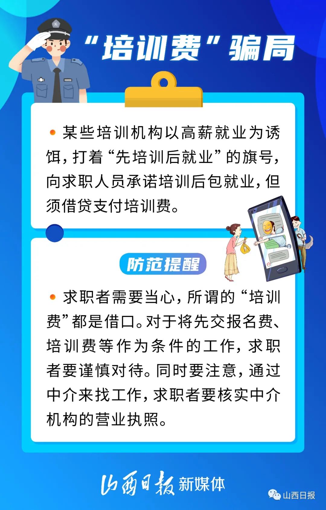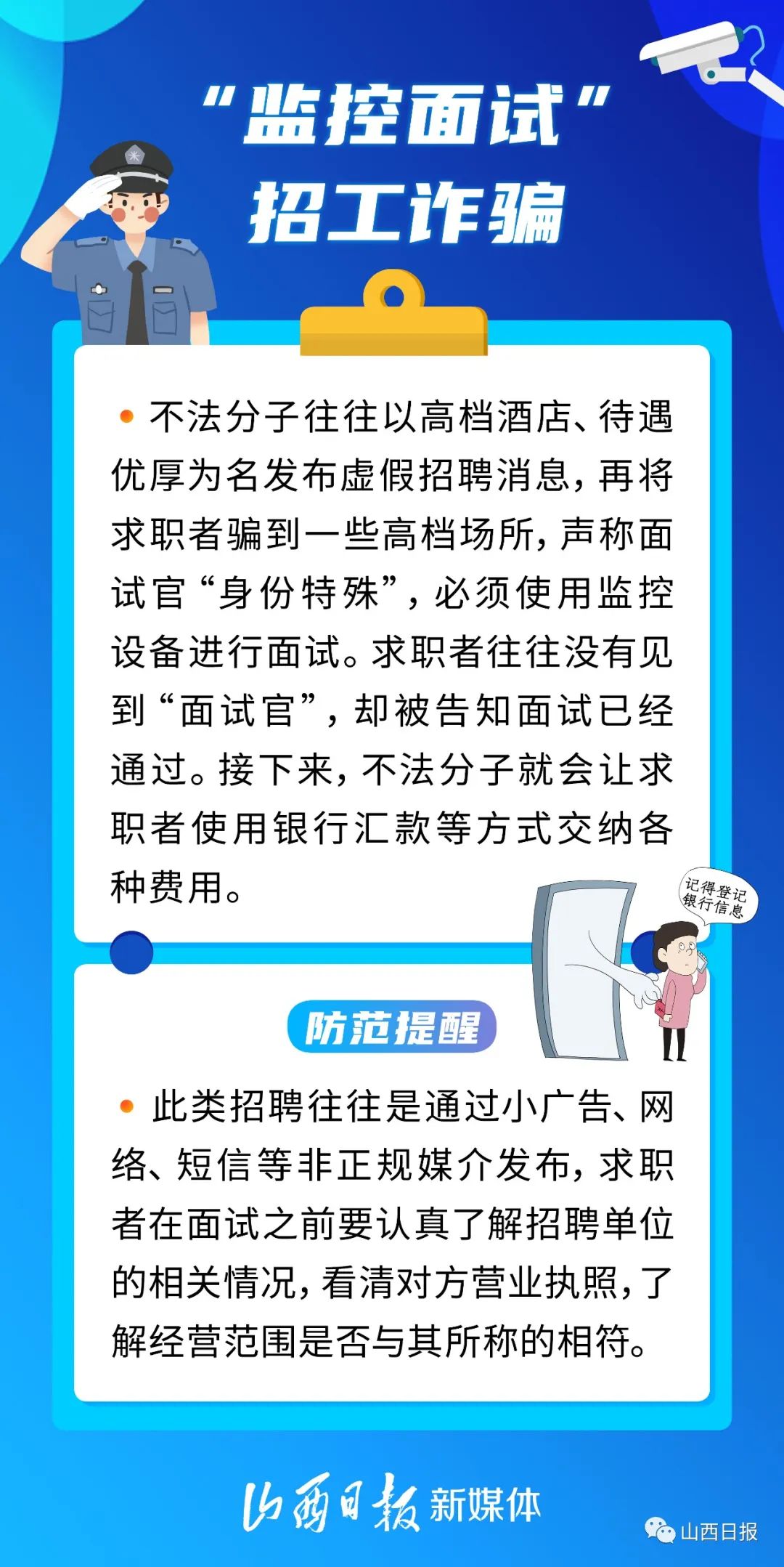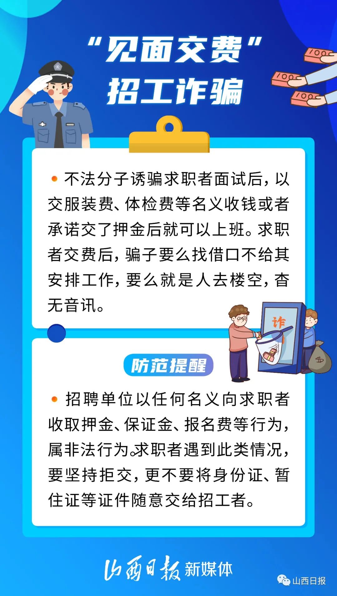 “网络刷单兼职”“见面交费”“先培训后就业”……找工作的时候,你有没有遇到过呢?又到毕业季,不少学生从校园走向社会。此时骗子们也蠢蠢欲动,打着“招工”等名义实施诈骗。以下6种常见的招聘骗局,提醒大家注意防范——