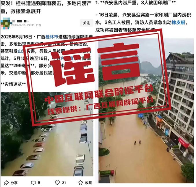 真相:近日,有网民在社交平台发文并配图称“5月15日晚至16日,桂林兴安县累计降雨量达299毫米,部分乡镇积水深度超过1.5米,交通中断,部分居民被困”“16日凌晨,兴安县迎宾路一家印刷厂因内涝积水,3名工人被困”,引发关注。经当地网信部门核实,上述图片及文字信息均严重失实,系谣言。2025年5月15日20时至16日20时,兴安县中南部普降小到中雨,西北部普降大雨到暴雨,最大雨量为兴安华江水厂气象自动站78.6毫米。兴安城区小雨,降雨量为7.4毫米。兴安县各乡镇并未发生暴雨导致内涝等情况。(来源:“广西互联网违法和不良信息举报”微信公众号)