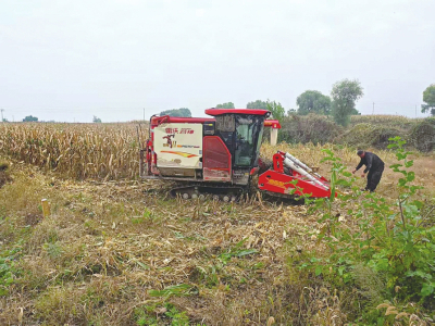 10月15日,晨光熹微,定襄县南王乡南王村的田野里已引擎轰鸣。履带式收割机所过之处,成行的玉米秆被整齐推倒、吞进“腹中”,金黄的玉米粒如瀑布般倾泻进储粮仓。