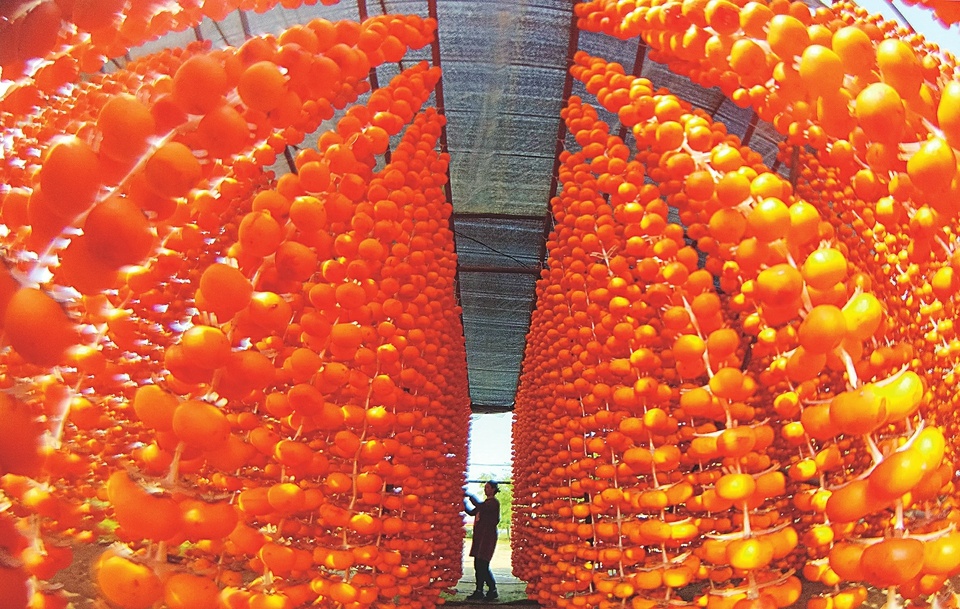 金秋时节,山西省运城市新绛县阳王镇禅曲村的柿子迎来丰收,连片金黄的果实挂满枝头。在该村种植加工大户许永安的“家庭微工厂”,柿农们正忙着将柿子削皮加工、上架晾晒。