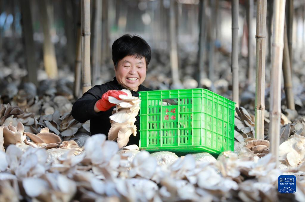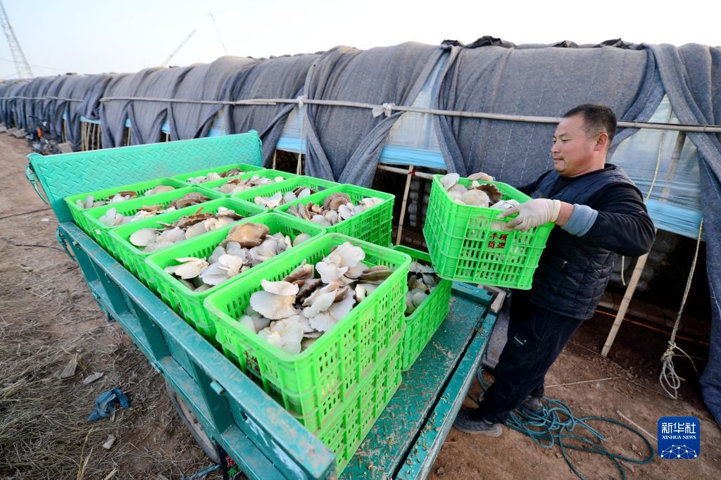 12月6日,在邯郸市肥乡区毛演堡镇路堡村,菇农在收集菌菇。(新华社记者 王晓 摄)