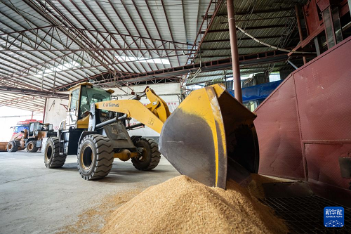 7月24日,在常德市鼎城区双桥坪镇一个水稻烘干工厂,工人驾驶铲车把稻谷放入烘干设备。(新华社记者 周勉 摄)