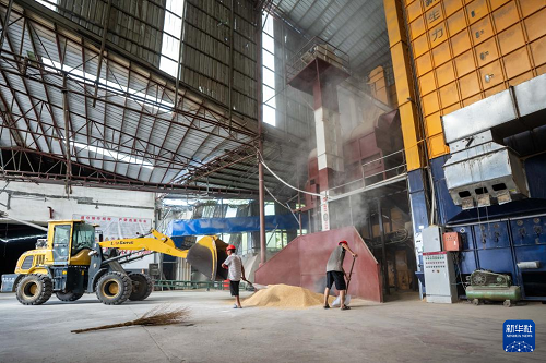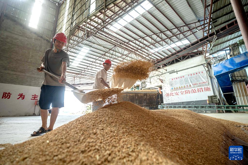 7月24日,在常德市鼎城区双桥坪镇一个水稻烘干工厂,工人把稻谷放入烘干设备。(新华社记者 陈思汗 摄)