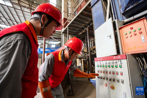 7月24日,在常德市鼎城区双桥坪镇一个水稻烘干工厂,国网常德供电公司电力工人在检查烘干设备电力供应情况。(新华社记者 陈思汗 摄)