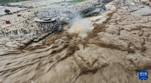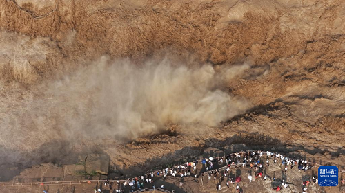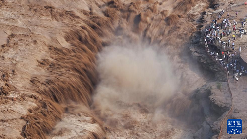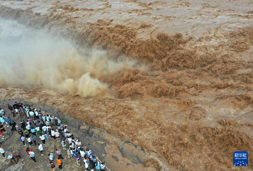 7月27日,人们在山西吉县观看黄河壶口瀑布(无人机照片)。(新华社发 刘宏达 摄)