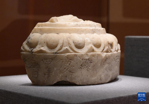 这是一件刻有“显庆四年五月”字样的唐代汉白玉莲花座残件(7月28日摄)。(新华社记者 李贺 摄)