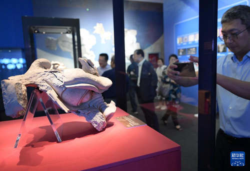 7月28日,观众在欣赏拍摄出土于雄安古州城遗址的唐代龙首。(新华社记者 李贺 摄)