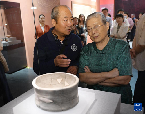 7月28日,著名考古学家、中国社会科学院考古研究所研究员安家瑶(右)在雄安新区联合考古队领队何岁利的陪同下参观展览。(新华社记者 李贺 摄)