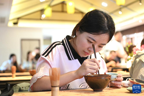 8月5日,在浙江省杭州市余杭区径山村,一名游客体验传统点茶。(新华社记者 毛竹 摄)