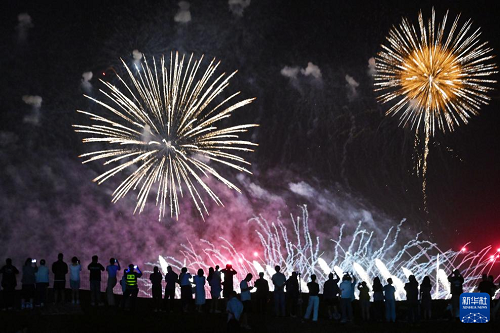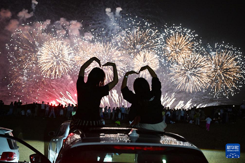 8月10日,游客在宁夏中卫市沙坡头区观看烟花表演。(新华社发 袁宏彦 摄)