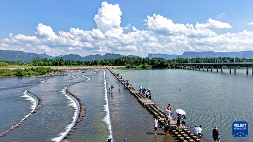 8月11日,游人在浙江省台州市仙居县永安溪白塔镇段游玩(无人机照片)。(新华社发 王华斌 摄)