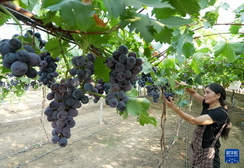 8月12日,河北省卢龙县蛤泊镇鲍子沟村一家葡萄种植合作社社员在采摘葡萄。(新华社记者 杨世尧 摄)