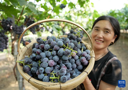 8月12日,河北省卢龙县蛤泊镇鲍子沟村一家葡萄种植合作社社员在展示刚采摘的葡萄。(新华社记者 杨世尧 摄)