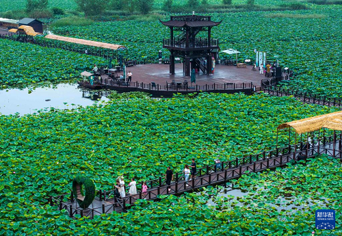 8月13日,游客在江苏省兴化市万亩荷塘景区赏荷游玩(无人机照片)。(新华社发 周社根 摄)