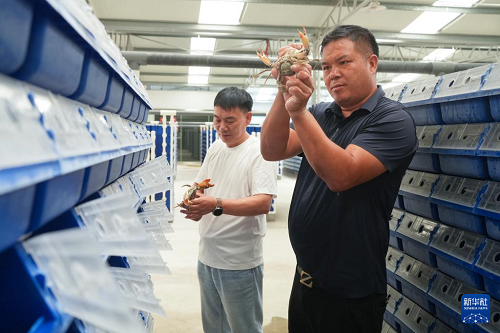 9月2日,在宁海县一市镇的一家青蟹生产企业,工作人员在暂储青蟹的“蟹公寓”中查看其健康状态。(新华社记者 翁忻旸 摄)