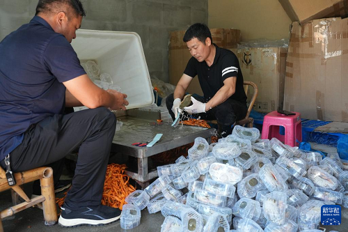 9月2日,在宁海的一家青蟹销售网店,工作人员将青蟹装箱快递。(新华社记者 翁忻旸 摄)