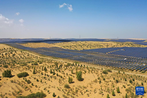 近年来,内蒙古开展防沙治沙与风电光伏一体化工程,推进库布其沙漠治理。目前,在鄂尔多斯市杭锦旗等库布其沙漠北部地区,一片片光伏基地在促进新能源产业发展的同时,成为当地生态治理、经济发展的坚实屏障。“光伏+生态治理”建设模式实现板上发电,板间、板下统筹兼顾特色生态修复、经济作物、造林绿化与技术创新,打造立体生态修复模式,让沙海变成绿色电能涌动的“蓝海”,实现生态效益与经济效益共赢。