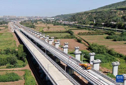 9月8日,施工人员在西十高铁西安东至蓝田区间铺设无缝钢轨(无人机照片)。(新华社记者 李一博 摄)