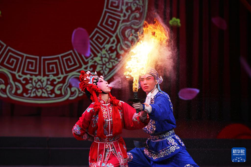 9月13日晚,在定西市陇中许铁堂秦腔剧院,演员表演秦腔绝活“吹火”。(新华社发 王克贤 摄)
