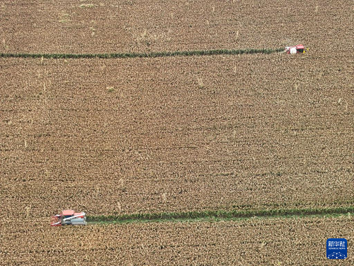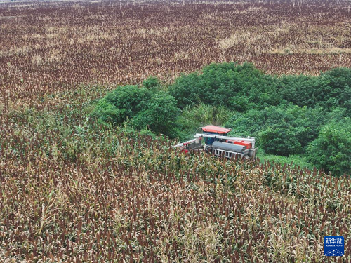 9月21日,收割机在地里收割高粱(无人机照片)。(新华社记者 季春鹏 摄)